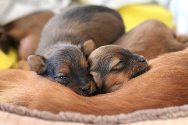 Saagan pentutrio kasvaa vauhdilla ja kaikki voivat erittäin hyvin. Pikkuhiljaa pennut alkavat liikkumaan enemmän ja yksi pennuista on pari kertaa kiivennyt jo pois pentukopasta. Piakkoin on siis aika siirtää pentuja isompaan tilaan temmeltämään. Kuvissa pennut ovat 2 viikon ja 1 päivän ikäisiä.